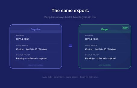 Buyers stop depending on suppliers for their own data. The previous state required a buyer to make a request to the supplier, wait for someone to pull the data, and receive a file that may or may not be in the right format. Self-serve exports eliminate that dependency entirely.